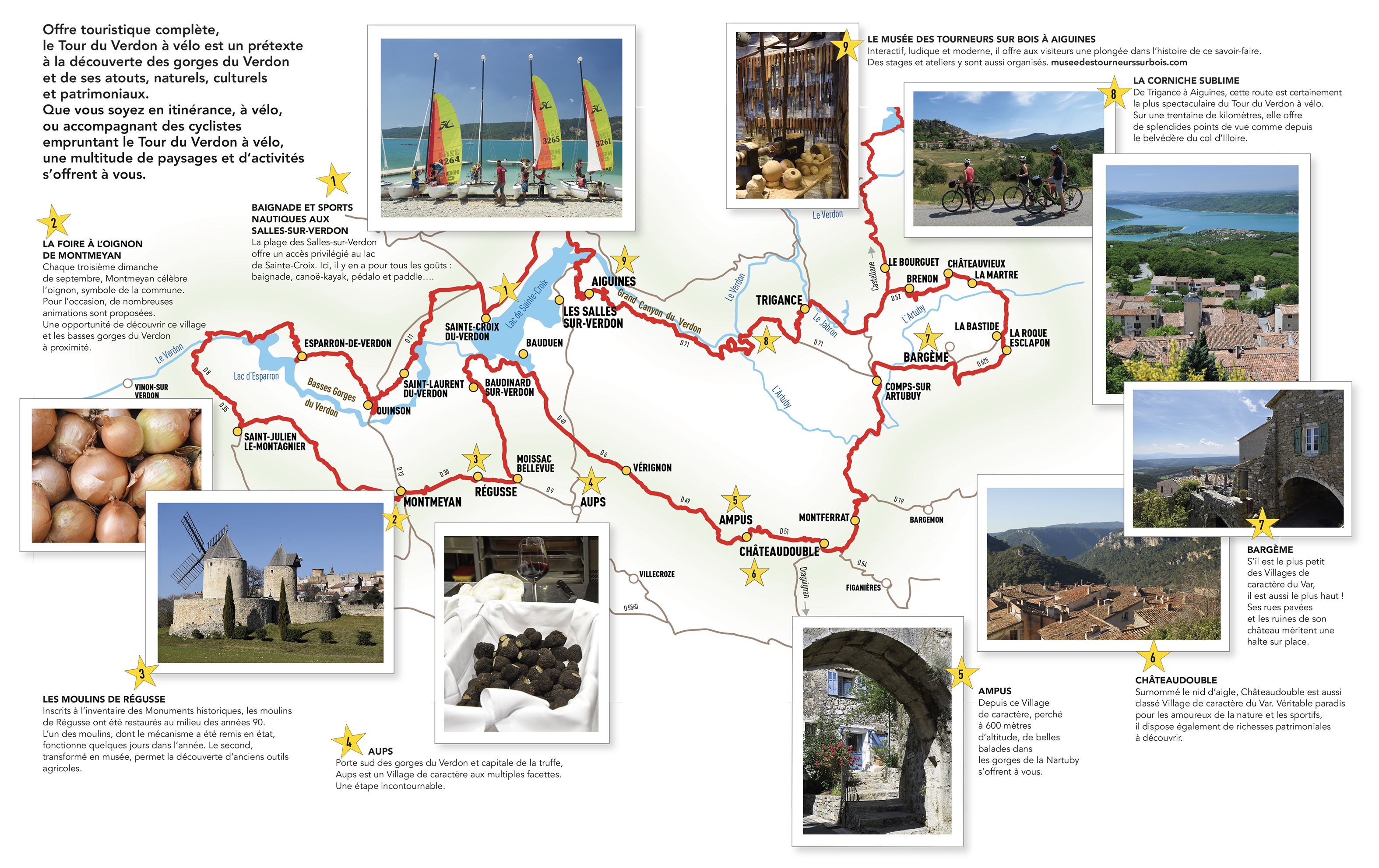 Découvrir le Verdon autrement. En prenant son temps. En appréciant les paysages offerts par le plus grand canyon d’Europe. En s’arrêtant au gré de ses envies. Cette invitation, cette promesse d’un tourisme différent, est celle du Tour du Verdon à vélo. De part et d’autre de la rivière, du Var aux Alpes de Haute-Provence, il traverse de nombreuses communes tout en offrant des points de vue exceptionnels sur les lacs et gorges du Verdon. Spécialement conçu pour les cyclotouristes, cet itinéraire de 256 kilomètres - dont 193 km dans le Var - est balisé dans les deux sens.